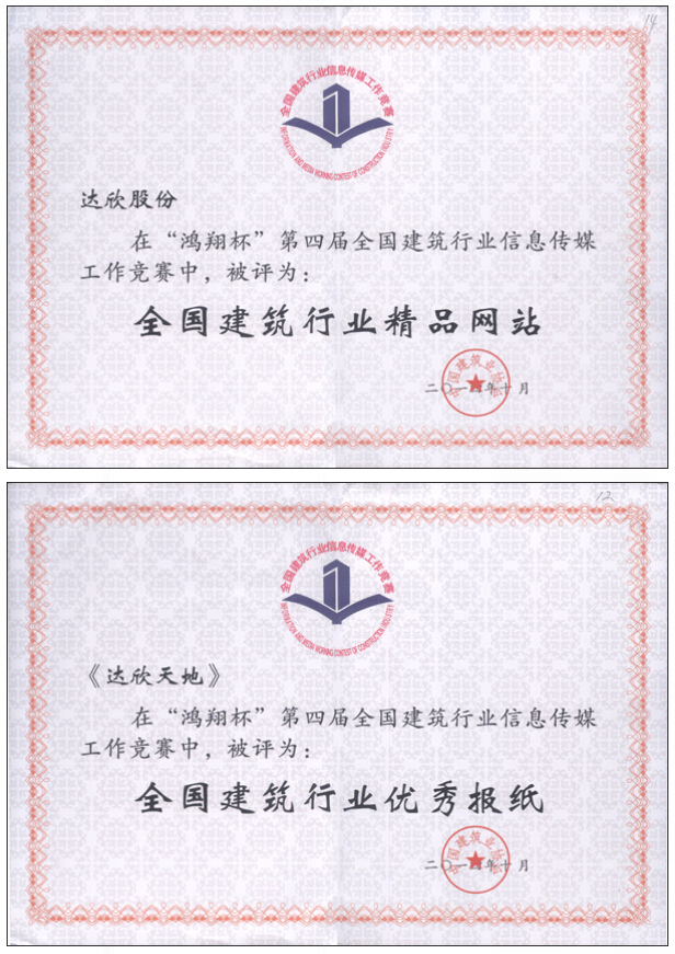 青海省建筑業協會副會長兼秘書長許光科致辭。中國建筑業協會副秘書長趙峰講話。江蘇省建筑市場管理協會會長汪士和、浙江省建筑行業協會副會長吳漢忠等領導出席了會議。會上向“鴻翔杯”第四屆全國建筑行業信息傳媒工作競賽的優勝者頒發牌證。“達欣股份”企業網站榮獲全國建筑行業精品網站、 “達欣天地”企業報紙榮獲全國建筑行業優秀報紙。